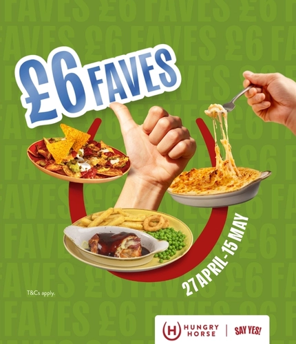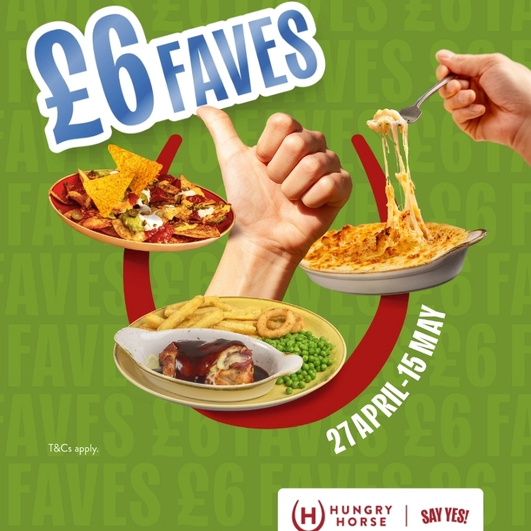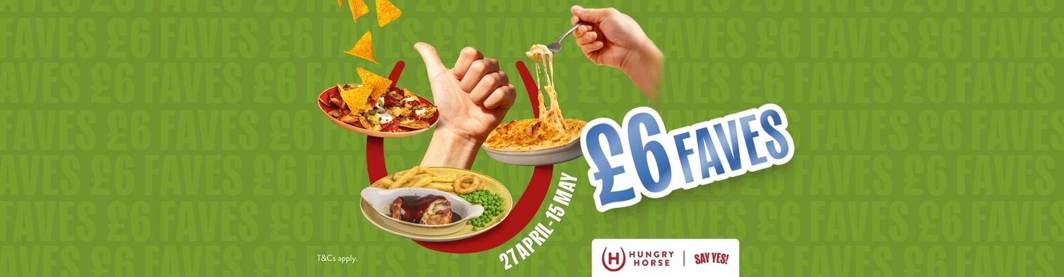 A banner promoting £6 Faves at Hungry Horse venues from 27th April to 15th May.