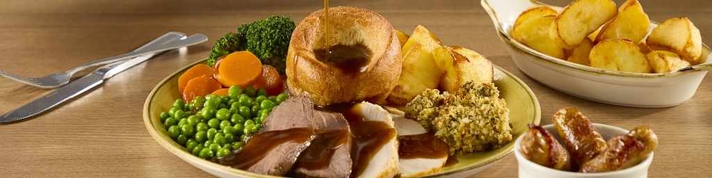 Looking for a Sunday roast in Basildon? You can expect a warm welcome for every member of the family, from the littlest to the largest here at Hungry Horse! Our family-friendly vibe means we're a place kids can play while parents enjoy a hearty Sunday roast and a much-needed pause. Eating out may seem like a pricey expense, but our Sunday deal means that you can enjoy a Sunday roast in Basildon and a delicious pudding without forking out. Pop by this Sunday, for lunch or dinner, and check out our generous menu for something to eat. Whether it's Hand-carved Roast Beef, Roast Turkey or our Vegetable Tart, there's always a plate to please!
