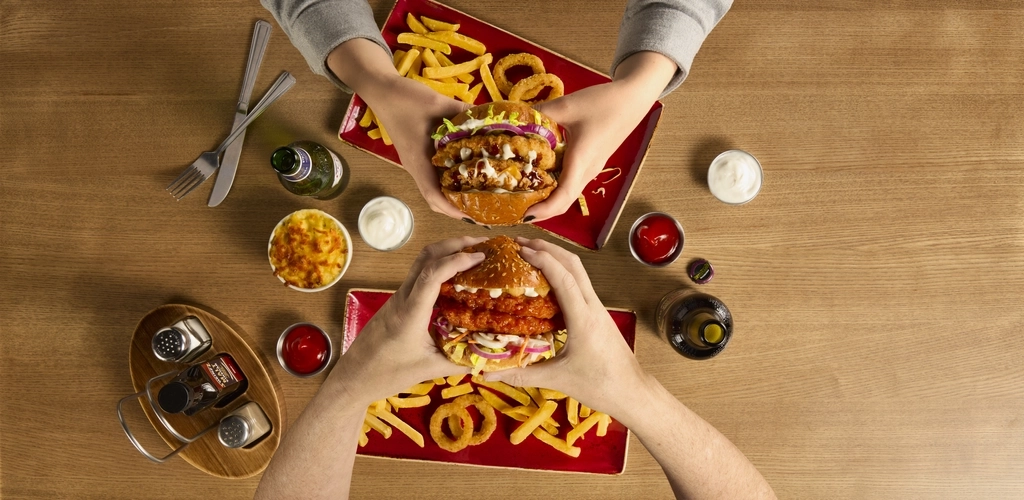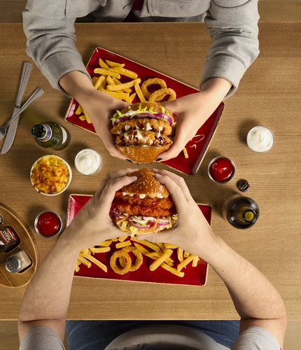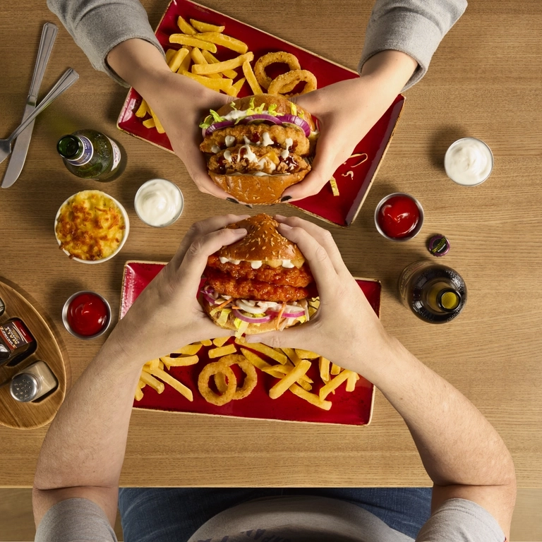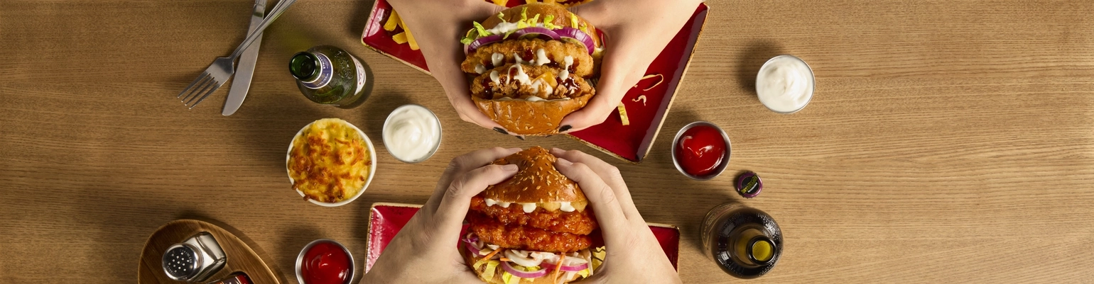 Our signature Triple Stack is something to behold. A double bacon cheeseburger topped with fried buttermilk chicken and nacho cheese sauce. Or, fancy The Smoky Rancher? Double crispy-fried buttermilk chicken, with melted cheese, Texan BBQ sauce, garlic & herb ranch, finished with crispy onions. Yum! It's GOT to be on your next order.