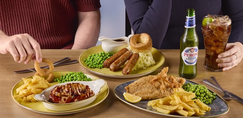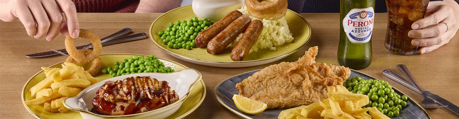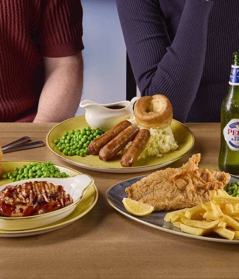 A plate of fish, chips, peas, and lemon, another plate of sausages, mashed potatoes, peas, Yorkshire pudding, and a jug of gravy, and another plate of chicken in a small roasting dish, fries, onion rings, and peas. The three plates sit on a wooden table along with cutlery, a glass of fizzy drink, and a bottle of Peroni lager.