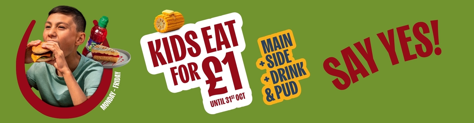 Little tums, big smiles, and zero stress for grown-ups – that’s the magic of our Kids Eat for a £1 offer! Whether it’s breakfast, lunch, or dinner, you can treat your mini foodies to a small meal, drink, pud, and a drink for just £1