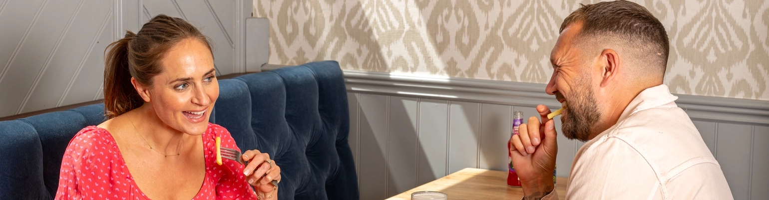 An image of 2 people enjoying burgers and drinks within the interior restaurant and seating area at a Hungry Horse venue.