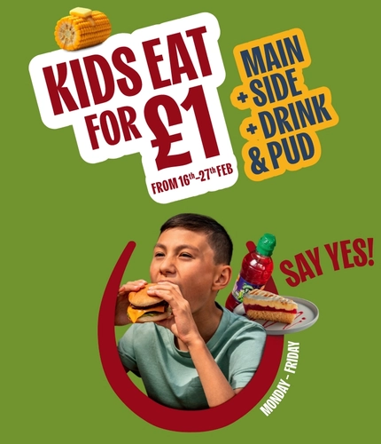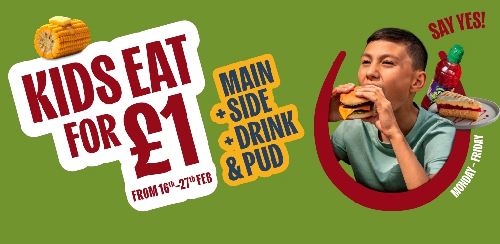A banner promoting Kids Eat for £1 from 16th to 27th Feb at Hungry Horse venues.
